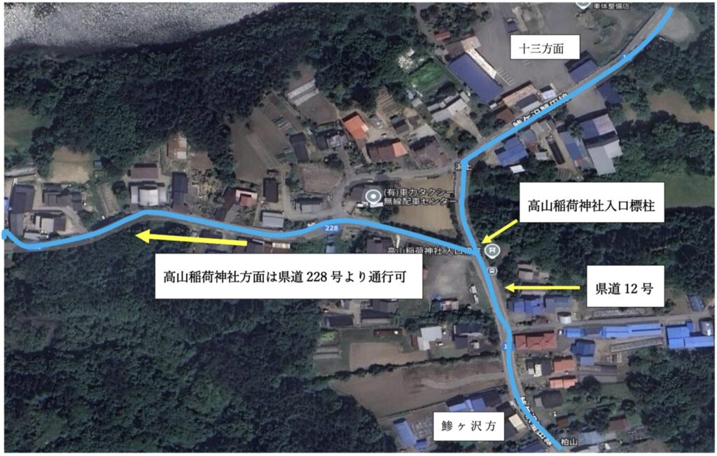 • 県道12号線を進み、県道228号線(「高山稲荷神社入口」の標柱が目印)へお入りください。