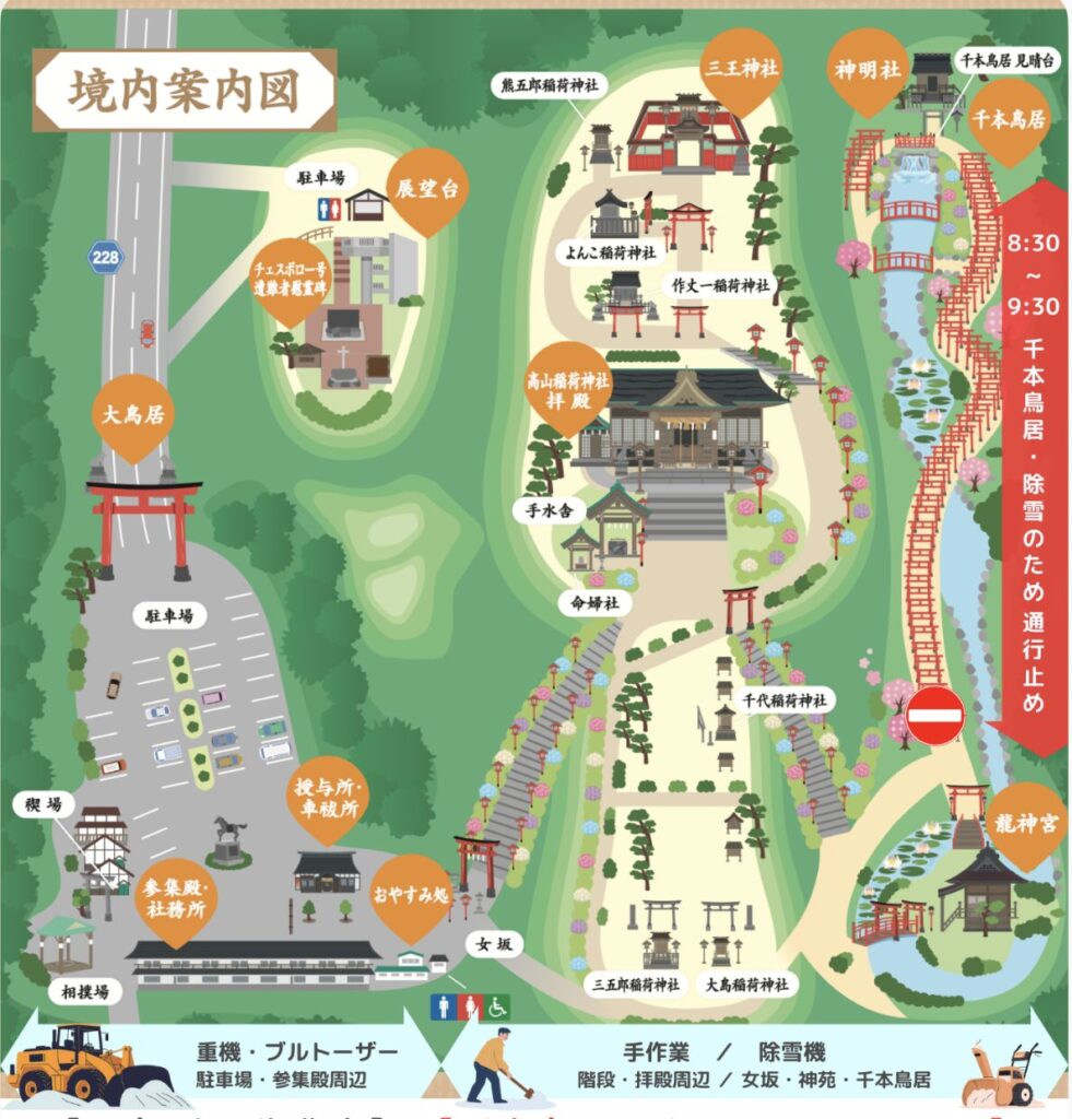 大雪の際、境内(駐車場内、神苑・千本鳥居内)では、皆様に安全にご参拝いただけるよう重機・除雪機による除雪作業を行います。作業中はご参拝の方の安全を第一に考え、一時的に通行止めとさせていただく場合がございます。