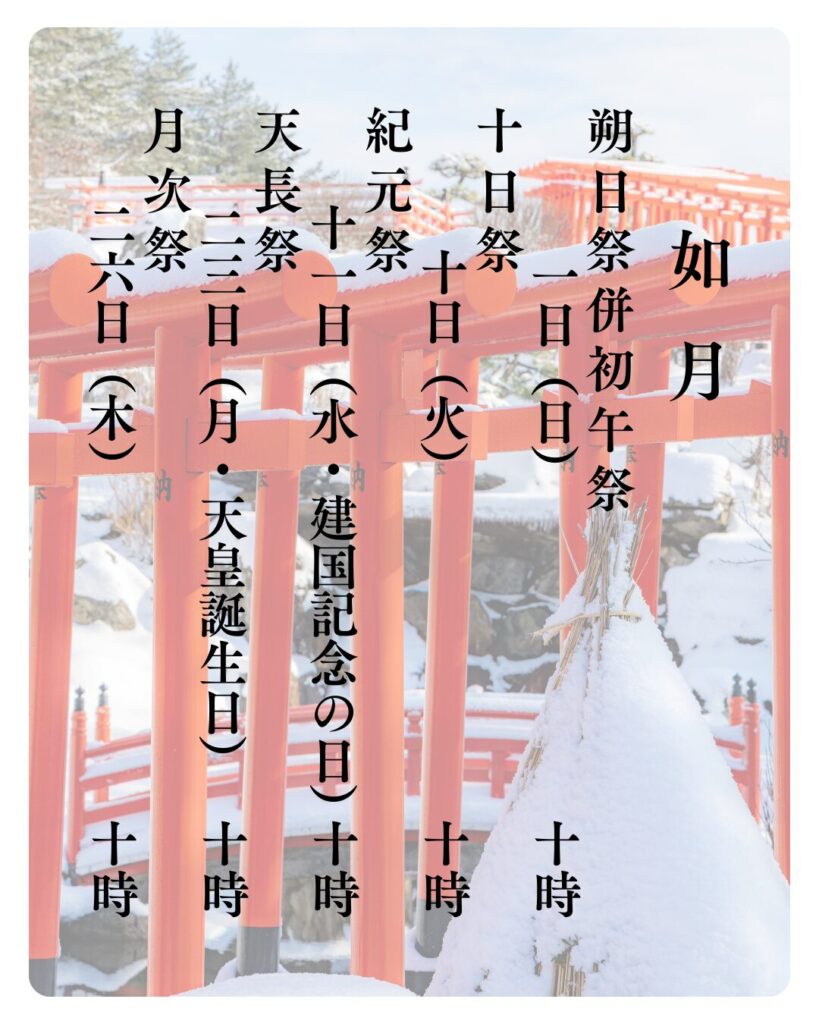「月詣り」とも云われ、毎月決まった日にお参りすることで神恩感謝を願うと共に、新しい月の無病息災・心願成就をお祈りいたします。