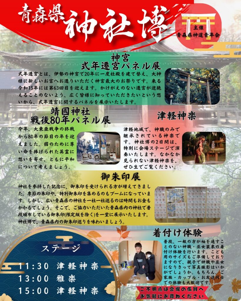 この度、青森県内の若手神職で構成される「青森県神道青年会」が主催するイベント、「青森県神社博」が開催されます。 当日は、県内各神社の御朱印が一堂に会する「御朱印展」や、神宮・靖国神社の貴重なパネル展示のほか、普段は神社でしか見ることのできない「津軽神楽」や「雅楽」の生演奏もお楽しみいただけます。